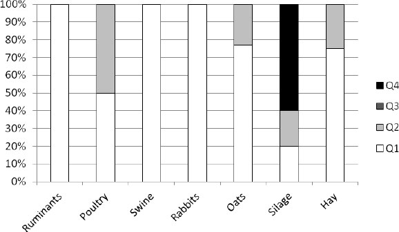 In the frame of official control, 130 samples of feed and feedingstuffs were analyzed in Switzerland (Fig. 5). All the analyzed samples of rabbits, mixed grains, and oats were classified at the desirable Q1 level. At the Q2 level 35% of maize, about 10% of silage and horses’ feed, and 3% of ruminants’ feed were classified. 50% of hay samples and 10% of horses’ feed were classified as feed distinctly reduced in Q3. As unsound (Q4) 5% of ruminant feed, almost 10% of poultry feed, 5% of swine feed, and a high 25% of silage.