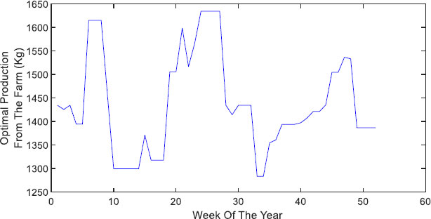 Fig. (9) shows the weekly volume used by the plants. Although the current farm has 4000 cubic meters of space for plants, not all of that volume should be used based on optimization results. Fig. (10) shows the total kg production on a weekly base. Although the farm can handle up to 2000 Kg per week, the maximum suggested volume by the model is 1630 Kg, and it goes to as low as 1275 Kg per week. This limitation is affected by both the market prices and target production. Relaxing the target constraints will result in more plantation and an increase in the volume used.