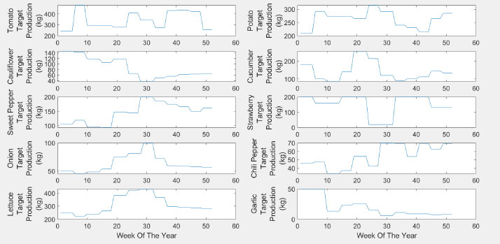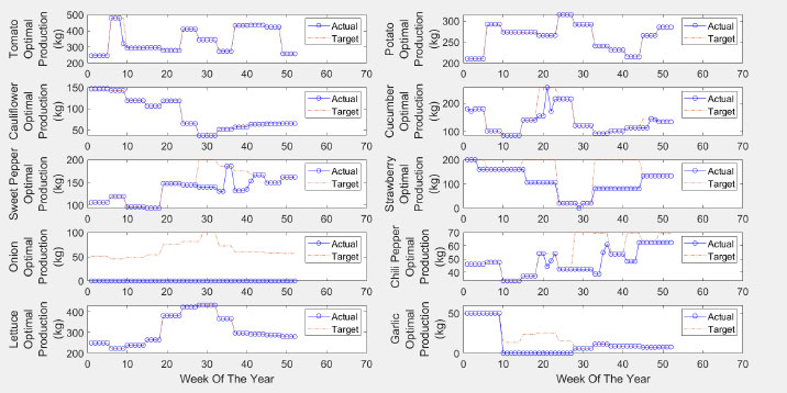 Fig. (11) shows the actual and target production for each plant. Most of the targets are met due to feasibility. Some plants are not suggested for plantation, such as onions. The same can be considered for sweet pepper, strawberry, chili, and garlic in some weeks.