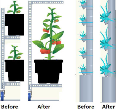 Mechanical engineering design can be used to develop flexibility in the shape of the plant containers. Fig. (2) shows some methodologies, such as flexible shelves design, where the size and the height of the shelve can be modified to accommodate more plants when they are small by using lower shelves when plants are just planted and germinated while the shelves can be moved up to accommodate plants when they have grown. Also, Fig. (2) shows another popular hydroponics system in pipes, where extension pipe units can be added as the plant grows to accommodate the larger size of the plant.