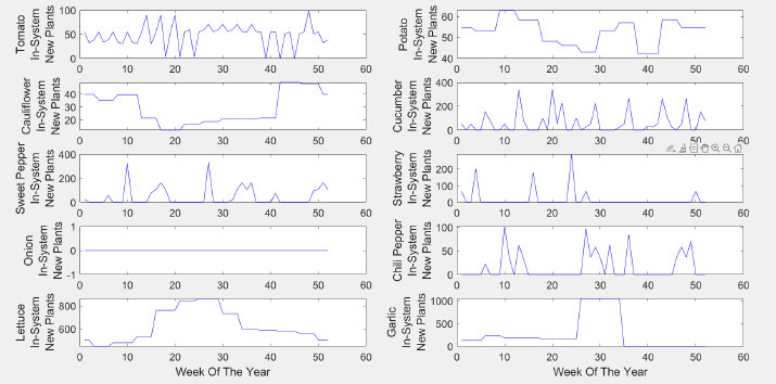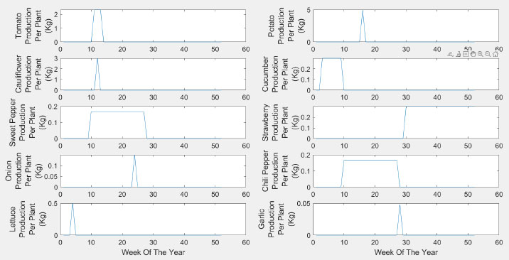 The income of hydroponics for the current model comes from the sales of vegetables. The farm under consideration is an urban farm within a city, and thus we can exclude multiple aspects that are usual costs for traditional farming, including major transportation costs, lost production due to insects or pests, wasted plants prior to sale, disposable packaging, supply chain costs due to direct sales to customers, etc. The assumption of zero or minimal waste is due to minimum handling and minimum transportation. The production per plant was obtained from previous studies [47-49] for all of the plants under consideration and is shown in Fig. (3). The objective function includes three variables, sales, production per plant, and cost. This kind of information is obtained from experts in the field and the Jordanian department of statistics [50]. For example, the tomato plant can produce in the 11th week after plantation, and it provides an average of 2.33 Kg each week for three weeks in a row. Fig. (3) illustrates this for the 10 plants of interest. Some plants have continued production for many weeks, such as chili pepper, while others produce once, such as garlic, onions, lettuce, and cauliflower. Fig. (3) illustrates that the plantation in the system is made in week zero if, in any case, the placement in the system is done in week i the whole curve is shifted to the right with weeks. For example, if a tomato plant is placed in the system in week 3, it will start to produce in week 14 (11 weeks from the zero-week plantation plus 3, which is the start of the plantation).