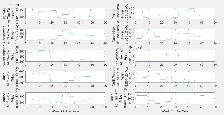 To obtain weekly pricing, we used certain officially selected references [51, 52]. Fig. (4) shows the seasonality for the different plants' prices at different weeks of the year. It is not unusual for the prices to double or even triple over a year. The prices are the lowest during high seasonal production. The highest pricing is noticed for out-of-season or in case of an event that resulted in damage to the traditional farming crops, especially due to uncontrolled weather conditions, such as very high or very low temperatures.