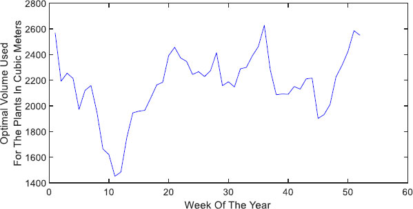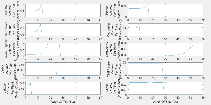 Constraints are shown in equations 2-16. Equation 2 is related to volume. Traditional outdoor farming is limited by the land size that is measured by square meters. Things are different in a properly designed hydroponic system; we can go vertically. The land is not the major issue; instead, we are limited by the volume. As discussed earlier, we evaluated the volume taken by the different plantations and placed that in the matrix (V). Vij is the volume taken by plant i in week j. Xi is the number of plants I placed in the system. XiVij is the weekly used volume for the 52 weeks; this value should be less than 4000 m3 (For this work, we have focused on constructing a 4000 m3 (25 m × 20 m × 8 m) hydroponic farm). Fig. (6) shows the volume consumed per plant starting from the day it is placed in the system.