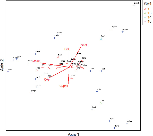 Concerning the dynamics of weeds, the ordination diagram (Fig. 2) shows that there is a slight link (13%) between the classes, the capacity to be a reservoir of Xoo and Xoc of weeds, and the distribution of collection sites. Indeed, regarding the capacity to be a Xo reservoir, it appears that dicotylodonous (Dicot) species do not host Xo strains at any site. However, Cyperaceae (Cyp), reservoirs of Xo are mainly present in Karfiguèla. As for the Poaceae (Gra) reservoirs of Xo, they are more present in Banzon and Karfiguèla.