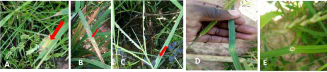 (i) typical symptoms of BLS (Fig. 3A-C) on Oryza longistaminata, Sacciolepis africana, Paspalum vaginatum, and Echinochloa colona;
