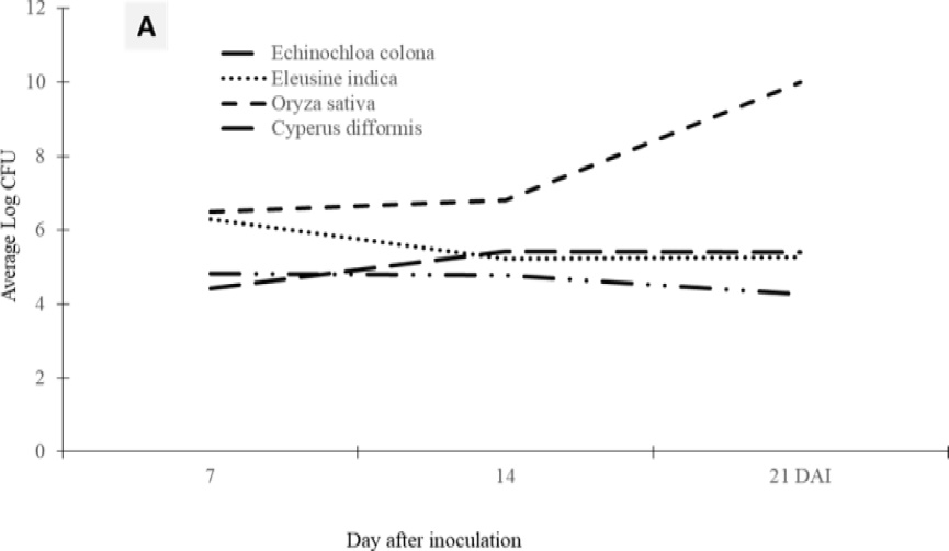 All species of Poaceae and Cyperaceae retain Xoc after inoculation except for Fimbristylis littoralis. Indeed, this species is characterized by hard and thin leaves, difficult to infiltrate. Our results confirm those [30], who indicated that Xoo and Xoc strains survive on wild or low-cultivated Poaceae. Analysis of the bacterial population dynamics in the leaves reveals Xoc strain's presence of 21 JAI with or without induced necrosis at the inoculation site [31]. Reported epiphytic survival of Xoo on wild grass leaves for 140 days. In our study, we noticed a larger Xoc population in the leaves of Poaceae than that of Cyperaceae. Indeed, Cyperaceae by their leaf structure can limit the penetration of bacteria and consequently their growth. They have a cylindrical shape at the level of their rachis, which gives them resistance to attacks from both external and internal factors.