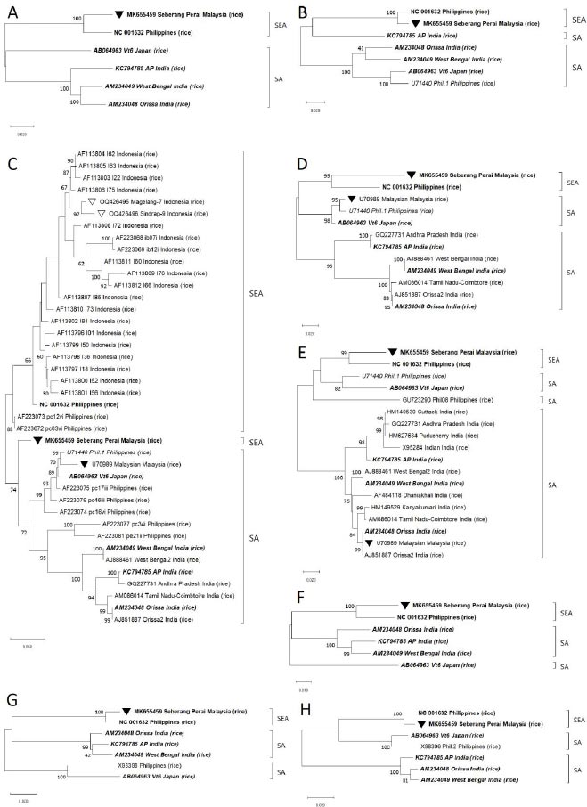 Fig. (2). Phylogenetic trees based on different regions of RTSV genome: (A). ‘Full ORFs’, (B). Hypothetical protein, (C). CP1, (D). CP2, (E). CP3, (F). NTP-binding domain, (G). 3C-like protease, and (H). RdRp were constructed using MEGA X software. Isolates were clustered according two major phylogroups: South East Asia (SEA) and South Asia (SA). Two new Indonesian isolates (Magelang-7 and Sindrap-9) were indicated with white triangle symbol in C. CP1 tree. The six isolates with full genome sequence were printed in Bold. Five isolates with significant recombinant events (AM234048, AM234049, AB064963, KC794785, and U71440) were printed in Italics while the two suspected recombinant isolates: U70989 and MK655459 were indicated with black triangle symbol. Clusters were supported by 1000 bootstrap replicates, only > 50% values were shown.