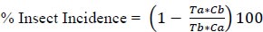 Where: Tb is the number of insects collected per sampling before treatment, at number collected after treatment, the Cb number collected from the check plot before treatment, and the Ca number collected from the check plot after treatment of the test plots.