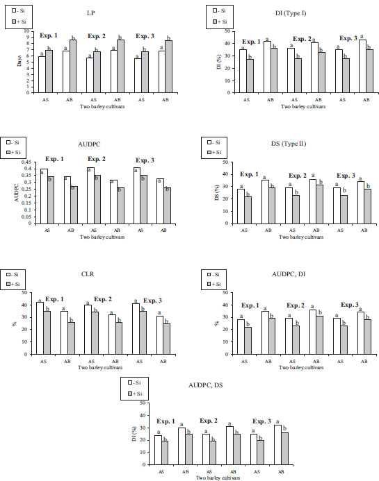 The bio-efficacy of Si to increase AS and AB barleys’ resistance to FHB disease was measured by the latent period (LP) of detached leaf inoculation, the area under the disease progress curve (AUDPC) of Petri-dish inoculation, and the coleoptile length reduction (CLR) of a coleoptile infection under in vitro conditions [26] (Fig. 2). The reduction in head blight symptoms due to the effect of Si was also expressed under growth conditions as DI (type I resistance), DS (type II resistance), and the area under the disease progressive curve (AUDPC) calculated on the basis of DI, type I and DS, type II (Fig. 2). Methods to clarify the nature of the Si-enhanced barley resistance under several experimental conditions were earlier described by Sakr [27] on Si-wheat-FHB interactions. Therefore, we were able to examine the relationship between the current findings and the previous results of in vitro and growth chamber environments to check whether Si could increase the expression of resistance to FHB infection at the earliest and latest barley development stages during FHB infection.