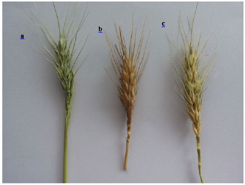 DI, DS, and FDK were determined to decide the degree of Fusarium infection in light of visual damage in head tissues. Assessment of disease development rates (DDRs) was achieved at the beginning of heads with discolored spikelets that were demonstrative of head blight about 1 week after inoculation. Thereafter, the gradual blighting of heads was assessed at 14, 21, and 28 days post inoculation (dpi), when wheat heads were at the soft dough stage. At 21 dpi for each Fusarium isolate/AS and AB, DI for type I resistance was evaluated by calculating the number of heads with representative head blight symptoms (i.e., partially or fully bleached heads). The estimates of DDRs determined at 7, 14, 21, and 28 days during the evaluation period were considered as an indicator to determine DS for type II resistance, as reported earlier by Sakr [22]. After harvesting, mature infected heads from each replication were taken for further evaluation; the heads were threshed to save infected and shrivelled grains. The percentage of scabby (tombstone) kernels was rated visually on one hundred kernels for each replication to assess FDK for type III [25].