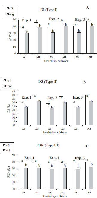 Supply of Si concentration at 1.7 mM significantly reduced FDK on AS being moderately resistant and on the moderately susceptible cultivar AB by 21 and 18%, respectively, in experiment 1; 21 and 18%, respectively, in experiment 2, and 23 and 20%, respectively, in experiment 3, compared to these cultivars without Si (Fig. 4c); this suggests that Si resulted in a quasi-similar reduction of FDK irrespective of the barley cultivar.