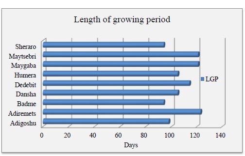 The agro-climatic potential of a land depends largely on the number of days within the year when the temperature regime and moisture supply are conducive to crop growth and development [36]. The length of the growing period is the period during the year when the rainfall exceeds half of the potential evapotranspiration (PET), and the period required to evapotranspire up to 100 mm of water from excess rainfall assumed to be stored in the soil profile [37]. The length of the growing period for each station (Fig. 3) was generated by selecting location by coordinates, except for Humera, which is available in the NewLocClim database.