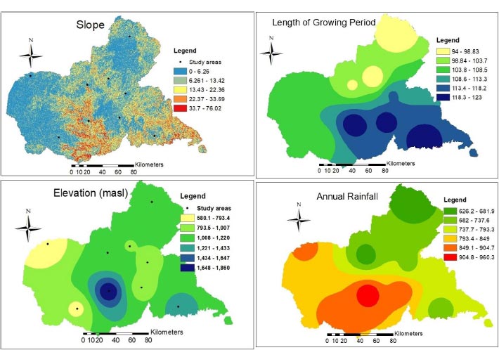 Temperature (maximum, minimum, and average temperature), annual rainfall, elevation, slope, growing degree days (GDD), and length of growing period were classified, and re-classified. Finally, a suitability map overlay was produced using ArcMap version 10.3.1