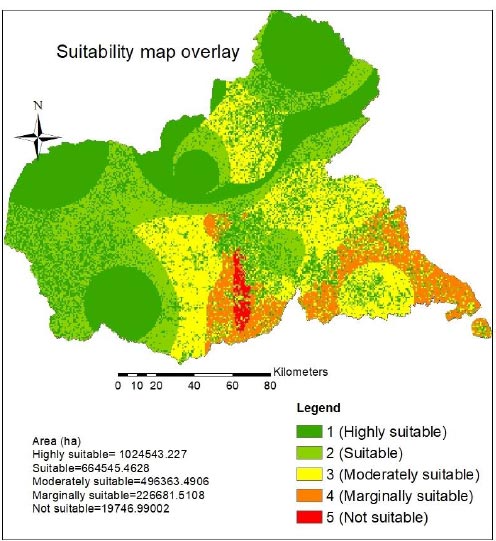 Selected variables/criteria have different measurement units, which requires a criteria standardization rating system. Thus, a weighted overlay method was applied to classify the suitability map of the study area by combining the selected variables. Before producing the suitability map overlay, re-classification of each variable was carried out to produce a combined suitability class overlay of the study area by standardizing it into equal interval approaches. This approach provides an opportunity to classify the contribution of the variables or criteria for the specified land suitability evaluation.