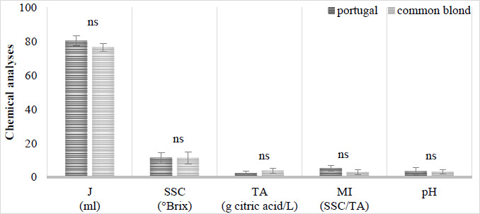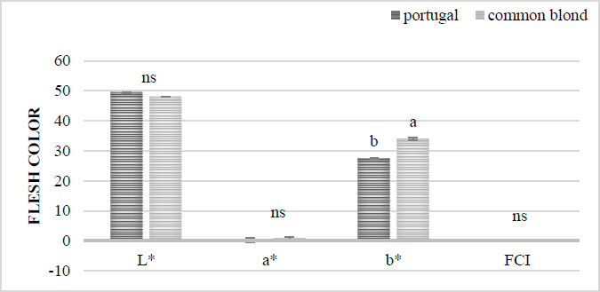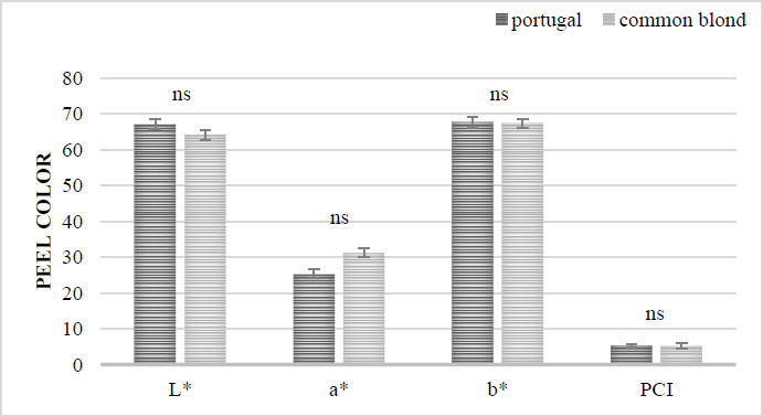 Columns indicate the means; bars indicate the standard deviation (SD) of three replicates (n=3). For each bar, ‘ns’ indicates no significant differences (p ≥ 0.05) between Portugal and Common Blond varieties, by Tukey's multiple range test.