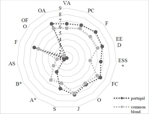 Legend: visual appearance (VA), peel color (PC), firmness (F), easy epicarp detachment (EED), easy separation of slices (ESS), flesh colour (FC), odour (O), juiciness (J), sweetness (S), acidity (A), bitterness (B), astringent (AS), flavour (F), off-odour (OFO), overall assessment (OA). Highlights statistically significant differences (p≤0.05) between the two analysed varieties.