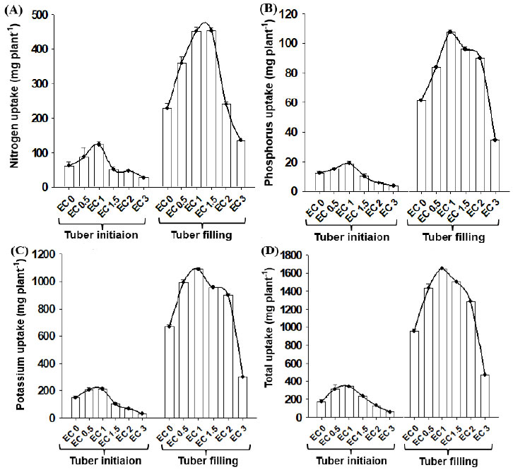 Nutrient uptake was found to be the highest in the tuber initiation and filling stages at EC 1.0, and potato growth was excellent as the concentration increased from EC 0 to EC 1.0 or 1.5. It was confirmed that nutrient uptake and growth were somewhat weak at values higher than EC 1.0. Chang et al. [27] and Calori et al. [28] reported similar results to those obtained in this study, noting that the aboveground growth and number of tubers were the highest at EC 1.0 in potato, and yield and growth decreased at EC 2.0 and higher. As a result, nutrient uptake according to the fertilizer concentration was the best at EC 1.0, and potato growth was the best at EC 1.0 and EC 1.5, but there was no significant difference among treatments, so EC 1.0, which has the lowest environmental risk from an excess nutrient supply standpoint, was chosen as the appropriate concentration to determine the fertilizer composition.