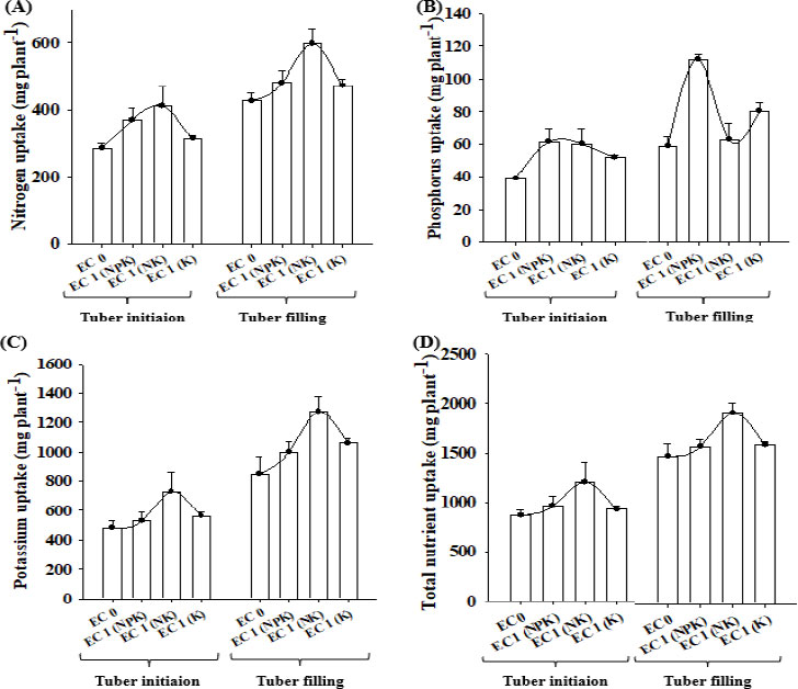 After we determined that nutrient uptake and growth were the best at the EC 1.0 concentration in the previous experiment, mixed or single-use fertilizers such as NPK, NK, and K were used to prepare the fertilizer solution at EC 1.0 and were applied at the tuber initiation and filling stages. Nitrogen and potassium uptake was highest in the NK treatment during both tuber initiation and filling and tended to decrease in the NPK, K, and irrigation treatments (EC 0) (Fig. 3). The uptake of phosphoric acid was highest in the NPK and NK treatments during the tuber initiation stage and highest in the NPK treatment during the tuber filling stage. Total nutrient uptake was the highest in the NK treatment in both the tuber initiation and filling stages, followed by the NPK, K, and irrigation (EC 0) treatments. Overall, the tuber filling stage had higher nutrient uptake than the tuber initiation stage.