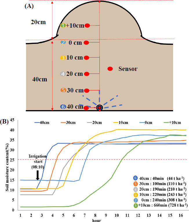 Subsurface drip systems have generally been used for protected horticultural crops such as tomato and melon, but they are now being used in field crops as well. In comparison to conventional irrigation methods, subsurface drip systems can be installed once and used semi-permanently. The irrigation equipment does not need to be removed after crop cultivation, and these systems are very effective technology, supplying water and fertilizers directly to the crop root zones [8]. Additionally, subsurface irrigation increases yield due to higher water utilization efficiency than conventional ridge irrigation [9, 10]. Furthermore, supplementing the water and fertilizer supply using subsurface drip systems increases the yield of field crops such as corn, soybean, garlic, and onion [11-13].