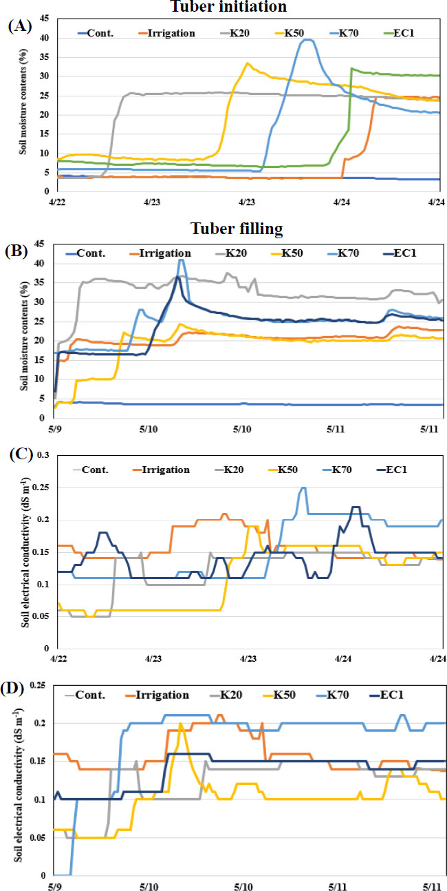 Potato fertigation treatment using the subsurface drip system was carried out during the potato tuber initiation and filling stages (Fig. 5A, B). It was confirmed that the EC changed in accordance with the fertigation treatments, confirming that the fertigation treatments were performed properly (Fig. 5C, D). The K 70 treatment had the largest EC variation in the root zone during both the tuber initiation and filling stages, followed by the K 50, EC 1.0, K 20, irrigation and control treatments. This shows that there was a significant change in EC in relation to the fertilizer concentration.