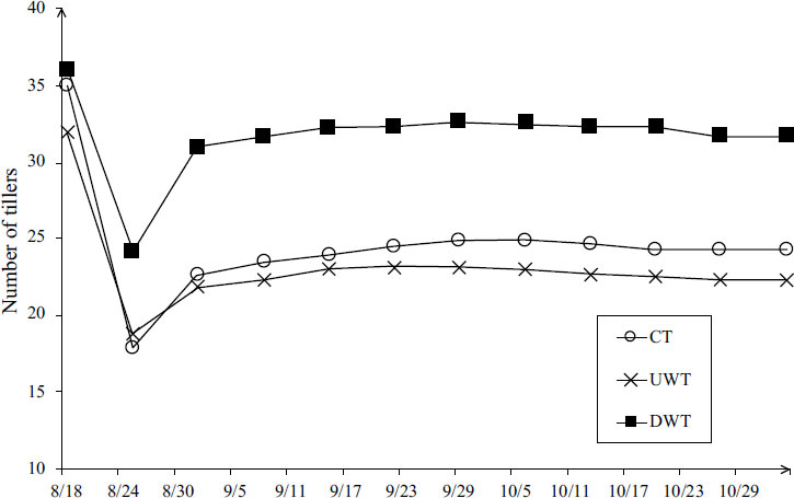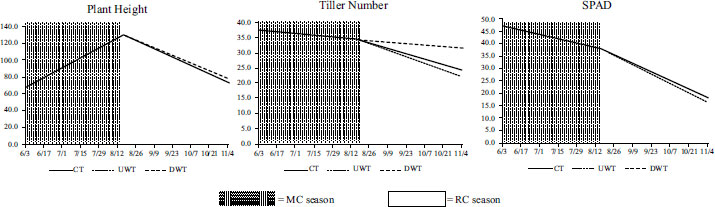 Data on plant heights, tiller numbers, and SPAD values for the three water treatments are shown in Fig. (2). For plant heights and SPAD values, no significant difference was observed across the three treatments. However, the ratoon tiller number showed differences across the treatments, with DWT having the highest and UWT having the lowest values. The change in tiller numbers was also observed once a week during the ratoon season (Fig. 3). The results show that starting a week after the first harvest, the initial tiller numbers were greater for DWT than for the other two. Table 3 shows that the tiller reproduction rate was the highest for DWT at 92.2%, and the lowest for UWT at 65%, consistent with the tiller growth data.