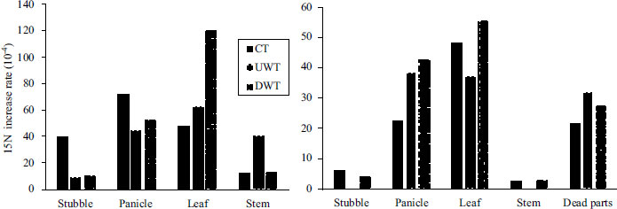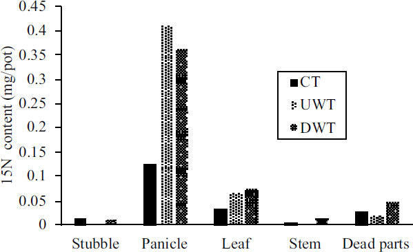 The rate of increase in 15N during heading and harvest is shown in Fig. (4). The 15N increase rate during heading was higher in the panicles and leaves, with DWT showing the highest for leaves. The 15N increase rate during harvest was also higher in the panicles and leaves, and lower in the stubble and stems. However, the values for the 15N content in the plants during harvest Fig. (5) show that most of the 15N was contained in the panicles, with lesser amounts in the leaves. Although the higher 15N increase rates were mostly seen in DWT, the amount of 15N in the panicles was the highest in UWT.