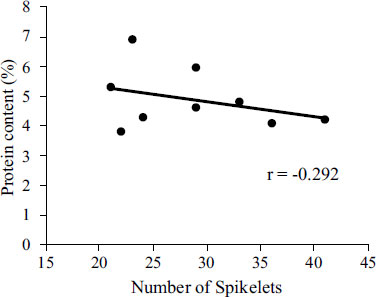 The correlations between accumulated temperature and grain thickness with respect to amylose and protein content across the three treatments are given in Table 6 and the correlation between protein content and number of spikelets is shown in Fig. (6). The accumulated temperature, measured from heading to ripening and harvest, showed a significantly positive correlation with amylose content and a negative correlation with protein content. Grain thickness showed a negative correlation with both amylose and protein content.