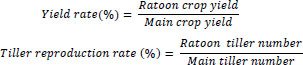 For the main crop season, the regrowth and yield rates were set to 100%. In the following regrowth season, the regrowth and yield rates were measured during the ratoon crop’s harvest season. These rates were calculated using the following formula: