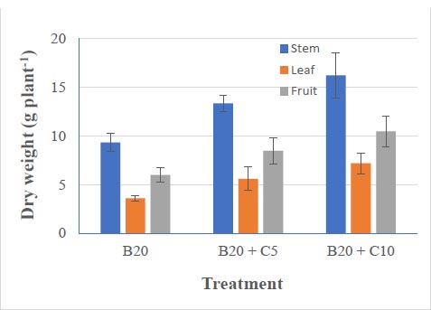 In the B20+C10 treatment, the dry weight of stems and leaves and fresh fruit yield were 16, 7.0, and 10.1 g ha -1, respectively (Fig. 4), higher than those in the combined treatment at B20+C5. However, the dry weights of the stems, leaves, and fruits in the biochar B20 treatment were significantly lower at 9.34, 3.60, and 5.99 g ha -1, respectively.