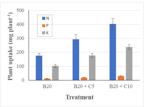 Total plant N, P, and K uptake, considered the total N, P, and K contents of the plant stems, leaves, and fruits, was measured after the destructive harvest on May 28 th, 2022. The highest N, P, and K uptake was recorded for B20+C10 treatment plants at 400 mg N, 29 mg P, and 237 mg K per plant (Fig. 5), whereas the lowest uptake was for B20 treatment at 175 mg N, 10 mg P, and 102 mg K per plant.