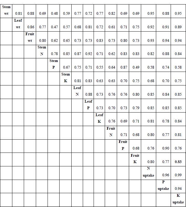 Among the correlation coefficients presented in Fig. ( 6), correlations between N, P, and K uptake and dry weight were significant. The positive correlations between N uptake and stem (r = 0.95), fruit (r = 0.92), and leaf (r = 0.93) weights (Fig. 6) were highest compared to the correlation relationship between P uptake and stem (r = 0.88), fruit (r = 0.91), and leaf (r = 0.84) weights. Similarly, the K uptake capacity was also strongly correlated with stem, fruit, and leaf weights at r = 0.95, 0.89, and 0.94, respectively.