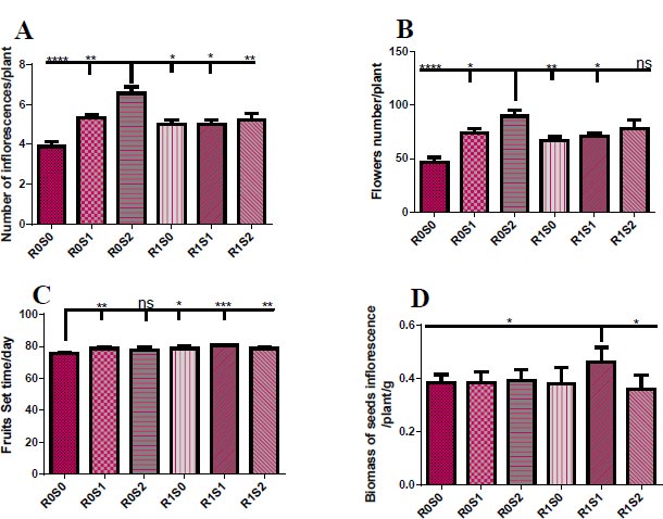 Fig. (2) elucidates the floral growth parameters of treated plants with camelthorn extract and salinity concentration. 12 dS/m-irrigated plants exhibited an increase in the number of inflorescences and flowers per plant compared to other plants (Fig. 2A, B). For the set time of Dill fruits, control plants R0S0 showed early set fruit time compared to treated plants (Fig. 2C). While treatment with 3 g/L of camelthorn extract and 6 dS/m salinity R1S1 caused an increase in the weight of seeds inflorescence compared to other plants (Fig. 2D).