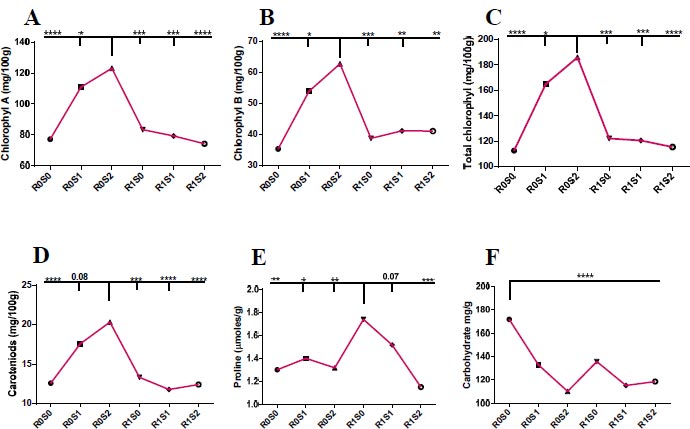 (A) Representative the effect of treatment with Camelthorn extract and salinity on leaf content of chlorophyll A. R0S0 control or untreated plants. R0S1 plants that irrigated with salinity at 6 dS/m. R0S2 plants that irrigated with salinity at 12 dS/m. R1S0 plants that sprayed with 3 g/L of A. maurorum extract. R1S1 plants that sprayed with 3 g/L of A. maurorum extract and irrigated with salinity at 6 dS/m. R1S2 plants that sprayed with 3 g/L of A. maurorum extract and irrigated with salinity at 12 dS/m. (B) Representative of the effect of treatment with Camelthorn extract and salinity on leaf content of chlorophyll B. (C) Representative the effect of treatment with Camelthorn extract and salinity on leaf content of total chlorophyll. (D). Representative of the effect of treatment with Camelthorn extract and salinity on leaf content of Carotenoids. (E) Representative of the effect of treatment with Camelthorn extract and salinity on proline content. (F) Representative of the effect of treatment with Camelthorn extract and salinity on carbohydrate content. A multiple ANOVA was performed using ordinary one-way ANOVA multiple comparisons to compare the averages of treatments. Significance was designated as follows: *p < 0.05, **P < 0.01, ***P < 0.001, ****p < 0.0001.