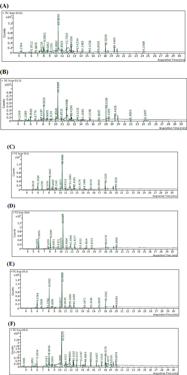 (A) Representative GC-MS profile of methanolic extract of R0S0 control or untreated plants. (B) Representative GC-MS profile of methanolic extract of R0S1 plants that irrigated with salinity at 6 dS/m. (C) Representative GC-MS profile of methanolic extract of R0S2 plants that irrigated with salinity at 12 dS/m. (D) Representative GC-MS profile of methanolic extract of R1S0 plants sprayed with 3 g/L of A. maurorum extract. (E) Representative GC-MS profile of methanolic extract of R1S1 plants sprayed with 3 g/L of A. maurorum extract and irrigated with salinity at 6 dS/m. (F) Representative GC-MS profile of methanolic extract of R1S2 plants sprayed with 3 g/L of A. maurorum extract and irrigated with salinity at 12 dS/m.