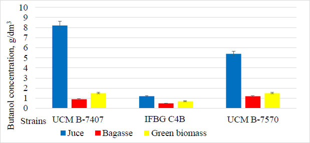 The strains of Clostridium sp. UCM B-7570, C. acetobutylicum UCM B-7407, and C. tyrobutylicum IFBG C4B were cultivated using juice, bagasse, and non-grain biomass of sweet sorghum as a substrate. The resulting accumulation of butanol is presented in Fig. (4).