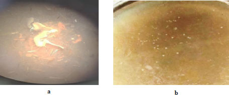 The obtained results indicated that the UCM B-7570 strain forms colonies in all agar media. Characteristic lightening zones and accumulation of gas bubbles were formed around the colonies, which indicates that the UCM B-7570 culture can be used for the bioconversion of sweet sorghum biomass. The colonies changed their shape from a biconvex lens [4] to amoeba-like ones when grown in a layer of agar. This may be possibly due to the difficulty in the availability of the substrate (Fig. 5a). However, the colonies remained unchanged (Fig. 5b) under the conditions of cultivation on the agar surface in anaerobic conditions. After transferring the UCM B-7570 culture to a liquid medium, its fermentation activity did not change; therefore, the culture did not degrade and was capable of accumulating solvents in the culture liquid.
