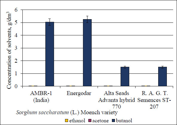 To study the possibility of butanol accumulation in a liquid medium, the colonies were transplanted from the agar medium to the created enzymatic medium, which contained 60 g/dm3 of each sweet sorghum genotype (Energodar variety, hybrid AMBR-1, hybrid-720, and hybrid ST-207) and the culture was planted UCM B-7570 with the subsequent accumulation of solvents in the culture liquid (Fig. 6).