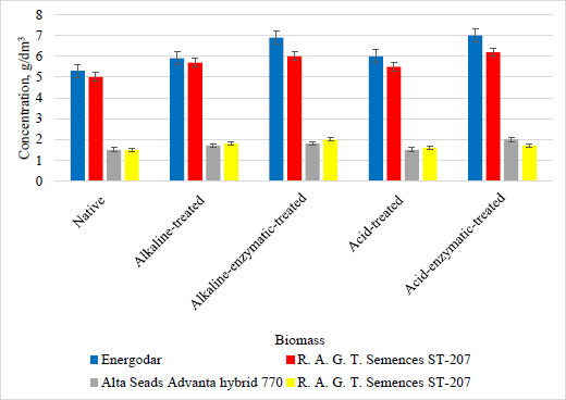 The highest level of butanol accumulation in the culture liquid occurred under the conditions of using sweet sorghum biomass of Energodar variety and hybrid AMBR-1 (5.2 and 5 g/dm3, respectively). However, hybrid-720 and hybrid ST-207 also accumulated butanol, but at lower levels (1.5 g/dm3 in both cases). To increase the bioconversion [18], pretreatment of the non-grain part of sweet sorghum biomass was carried out using alkaline, acid, alkaline-enzymatic, and acid-enzymatic hydrolysis. The obtained results of butanol accumulation under the conditions of cultivation of UCM B-7570 and pretreated non-grain biomass of sweet sorghum (Energodar variety, hybrid AMBR-1, hybrid-720, and hybrid ST-207) are presented in Fig. (7).