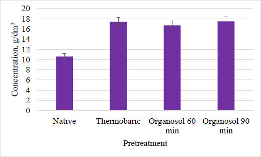To increase the output of biobutanol, Energodar variety sweet sorghum biomass was pretreated with various methods of hydrolysis: organosolv (for 60 and 90 min) and thermobaric (or explosive autohydrolysis). The resulting component composition of the raw material is presented in Table 2.