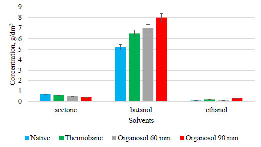 The highest level of accumulation of sugars was obtained under the conditions of enzymatic hydrolysis of sorghum biomass, which was pretreated thermobarically and via organosolv process for 90 min. The obtained results indicated that the availability of the substrate for enzymes increased during the pretreatment of biomass. It was shown that each type of hydrolysis of Energodar sweet sorghum biomass resulted in a sugar concentration of 17 g/dm3 after enzymatic treatment. Cultivation was carried out using organosolv and thermobaric hydrolysis of Energodar biomass, and the accumulation of solvents is shown in Fig. (9).