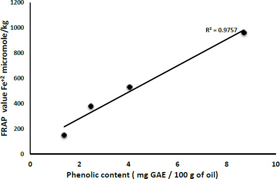 A statistical package for social science (SPSS, version 23.0) was used. Three replicates of each sample were used. Data were subjected to analysis of variance; the one-way analysis of variance (ANOVA) assessment was done to test the difference between different types of oil, and means were compared by least significant difference (LSD). P-values were calculated using the student t-test, and means with different superscripts (a, b, c) differed significantly at (P<0.05). Pearson correlation was used to investigate the association between phenolic content and FRAP value.