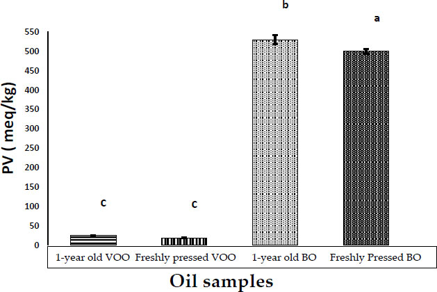 Fig. (3) depicts the peroxide value of freshly pressed boiled oil and stored boiled oil in comparison with freshly pressed VOO and stored VOO. The results showed a significant (P<0.05) increase in peroxide value in the freshly pressed boiled oil samples (500 ± 5.77 meq/kg) in comparison with the freshly pressed VOO l samples (19 ± 1.15 meq/kg). Moreover, the stored boiled oil samples showed a significant (P<0.05) increase in peroxide value (530 ± 11.45 meq/kg) in comparison with stored olive oil samples (25 ± 0.58 meq/kg). The deterioration of olive oil quality begins in the fruit [25], so chances that boiled oil will deteriorate more intensely might be due to high temperature and infusion of water into olive fruits during boiling [26] and exposure to sunlight for 2 weeks.