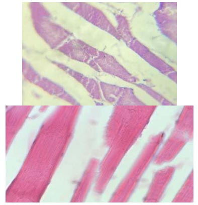 Histological analysis provides insights into muscle structure and variations in specific body areas. Additionally, by analysing tissue and cellular structures, it is possible to identify the structure of the product and determine its quantity. Therefore, a study examined the histology of tilapia's white muscles. The samples showed a moderate dissociation of muscle fibres, but the integrity of muscle fibre myofibrils was preserved in all the samples analyzed. The muscles exhibited apparent crossed striations.