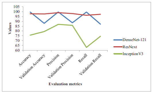 The DenseNet-121 detects and classifies the objects as healthy and unhealthy with a validation accuracy of 97.57% which is far better in comparison with other models. The existing CNN model ResNet has taken less time compared to other models. Table 1 shows the evaluation result of all the models with different evaluation metrics such as accuracy, validation accuracy, precision, validation precision, recall, and loss. The graphical representation of the evaluation result is shown in Fig. (10).