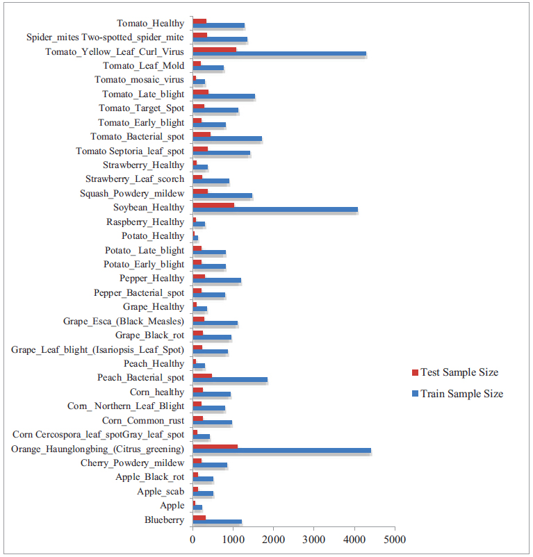 Plant Village [24] provided the plant leaf photos that were utilized to assess the performances (accessed on January 20, 2024). A public dataset called Plant Village Datasets (PlantVillageDataset) includes 54,305 plant leaves—both healthy and diseased—that were gathered in a controlled environment. Fourteen distinct crop kinds are included by the datasets: Apple, bluberry, Grape, Orange Cherry, Potato Peach Raspberry, and Strawberry Soy Squash. Fig. (1) displays a selection of sample images, and Fig. (2) provides an overview of the quantity of picture datasets collected for lesion identification and detection. It also includes the sample sizes for training and testing. The following common stresses cause diseases: water availability, temperature, nutrients, bacteria, viruses, and fungi.
