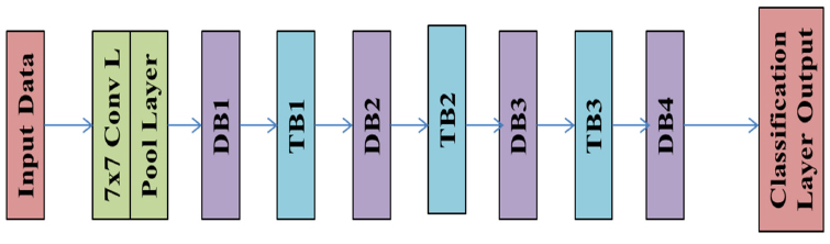 where Li is the layer's input, and Tr([L 0, L1, L2,... ... ..LL-1) is made up of feature maps from layers 0 to L-1 and concatenated together. The “Transition Block (TB)” and the “Density Block (DB)” are the two primary construction network varieties. Dense blocks are composed of multiple “Dense Layers (DL)”, one layer 1 x 1 Conv and 3 x 3 Conv layers comprise each DL layer.