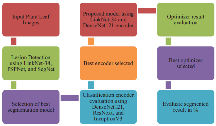 The encoder portion's picture downsampling is the main emphasis of the suggested technique. To ascertain which encoder performs best, a simulation is conducted utilizing three distinct encoders on the LinkNet-34 architecture: DenseNet121, ResNext, and InceptionV3. When compared to PSPNet and SegNet models, the experimental analysis shows that the LinkNet-34 model performs the best for semantic segmentation. Subsequently, the optimal LinkNet-34 model is subjected to three distinct encoder applications: DenseNet121, ResNext, and InceptionV3 of these, DenseNet121 has demonstrated the highest encoder performance. The findings support the proposal of the LinkNet-34 model with the DenseNet121 encoder for lesion segmentation from plant disease images. Finally, using Adam optimizers, the recommended model's parameters are changed to successfully lower the loss function. This is an important step in the training process because the model's performance and training speed can be significantly impacted by the optimizer selection and its hyper-parameters.