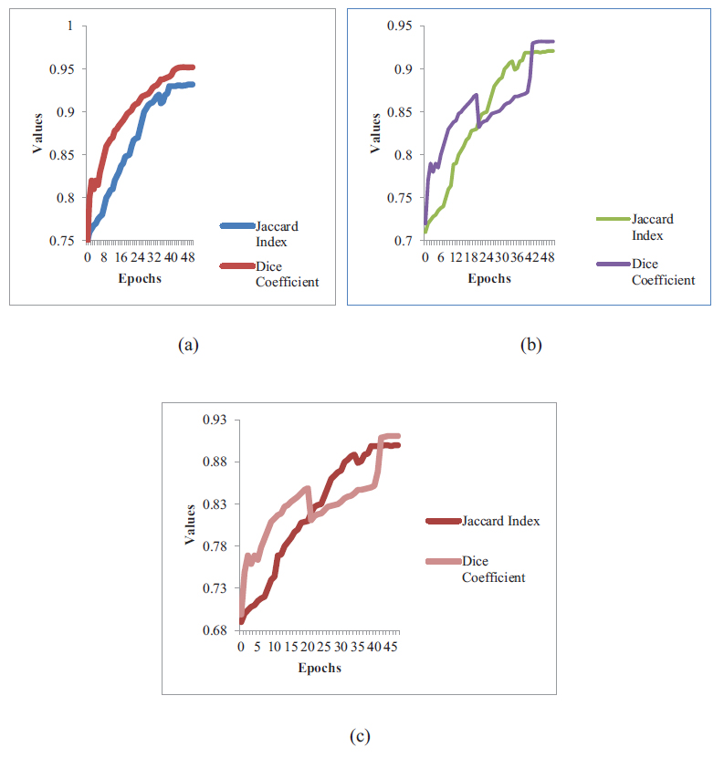As shown in Fig. (7) the LinkNet-34 segments the lesion objects with dice segmentation of 95.2% and a Jaccard index of 93.2%. Fig. (5a) shows the segmentation of the LinkNet-34 model, (b) shows the value of PSPNet and (c) shows the segmentation value of the SegNet model. The dice coefficient value drops down after the 20th epoch and then scales up with a value of 93% and continues with a value of 93.2% after the 44th epoch. Concerning this dice value, the Jaccard index shows a maximum value of 92.1%. The SegNet segmentation model does not detect the lesions of plant leaves with better detection parameters. It shows a dice coefficient of 941.1% with a Jaccard of 90%. From the above three segmentation models, the LinkNet-34 detects the lesions better as compared with the other two models.