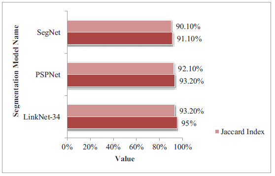 The DenseNet-121 encoder utilizing Adam optimizer has been outperformed by the LinkNet-34 model, with a dice coefficient of 95% and a Jaccard Index of 93.2% with a validation accuracy of 97.57%.