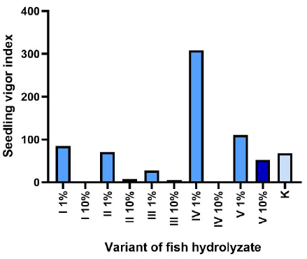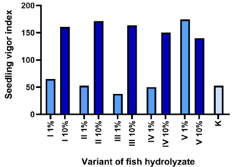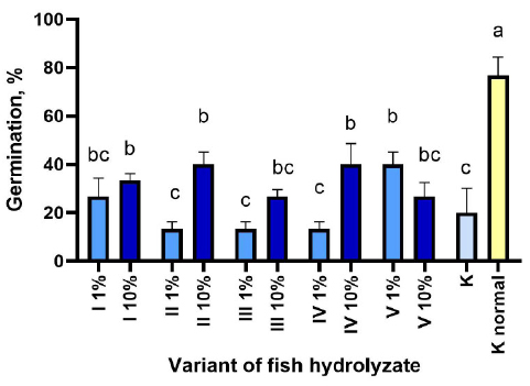 Increasing the percentage of seed germination is an extremely important issue for the agricultural industry, as it allows for a higher yield per unit area and more economical use of land and planting material. One of the methods of increasing yield is to select very high-quality seeds. However, this approach is not feasible on a large industrial scale. Therefore, the use of biostimulants is reasonable for increasing viability and germination rates. One of them, in our opinion, can be stimulants based on fish hydrolysates, which can also contain bioactive peptides with different types of activity [22].